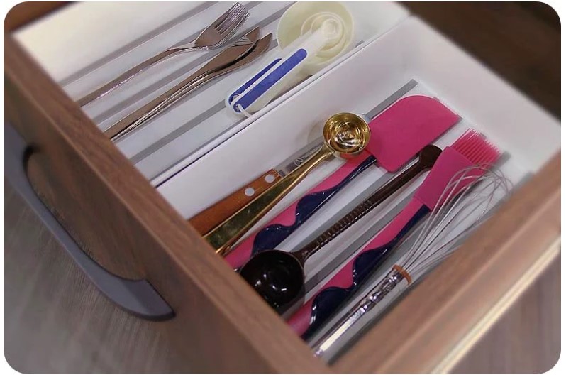 ▲下方收納抽屜內也可放入功能性的整理盒,規劃抽屜內的空間使用,放入餐具或各式工具。