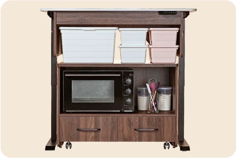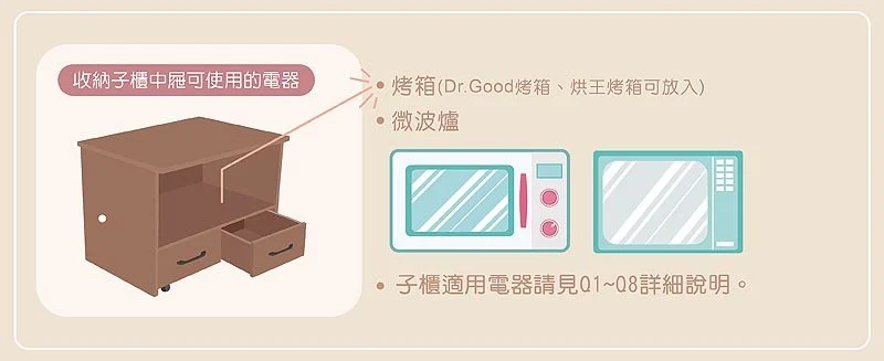 ▎收納子櫃可容納Dr.Good、烘王 等專業家用烤箱;子櫃不用時更可收入檯面主桌下!
