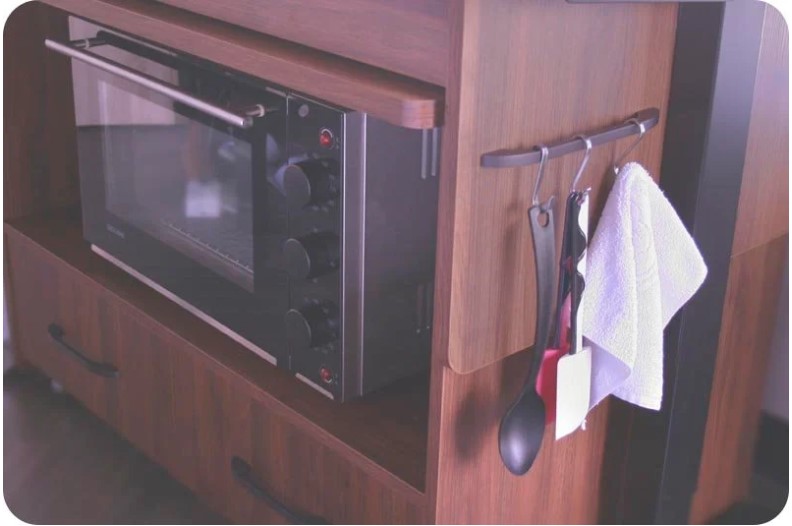 在主桌的桌裙兩側,我們加上了掛把的設計,只要加上S勾就可以將擦手巾或設有掛孔的工具掛上,也可以使用輔助掛籃來增加收納空間,放置調味的瓶瓶罐罐喔!