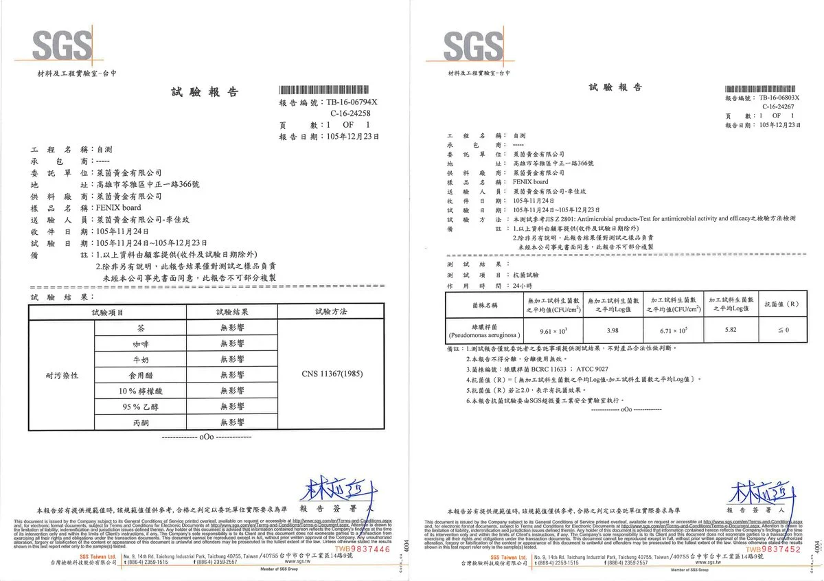 ▎食品級抗菌板材 「ARPA FENIX NTM」的SGS檢驗證明