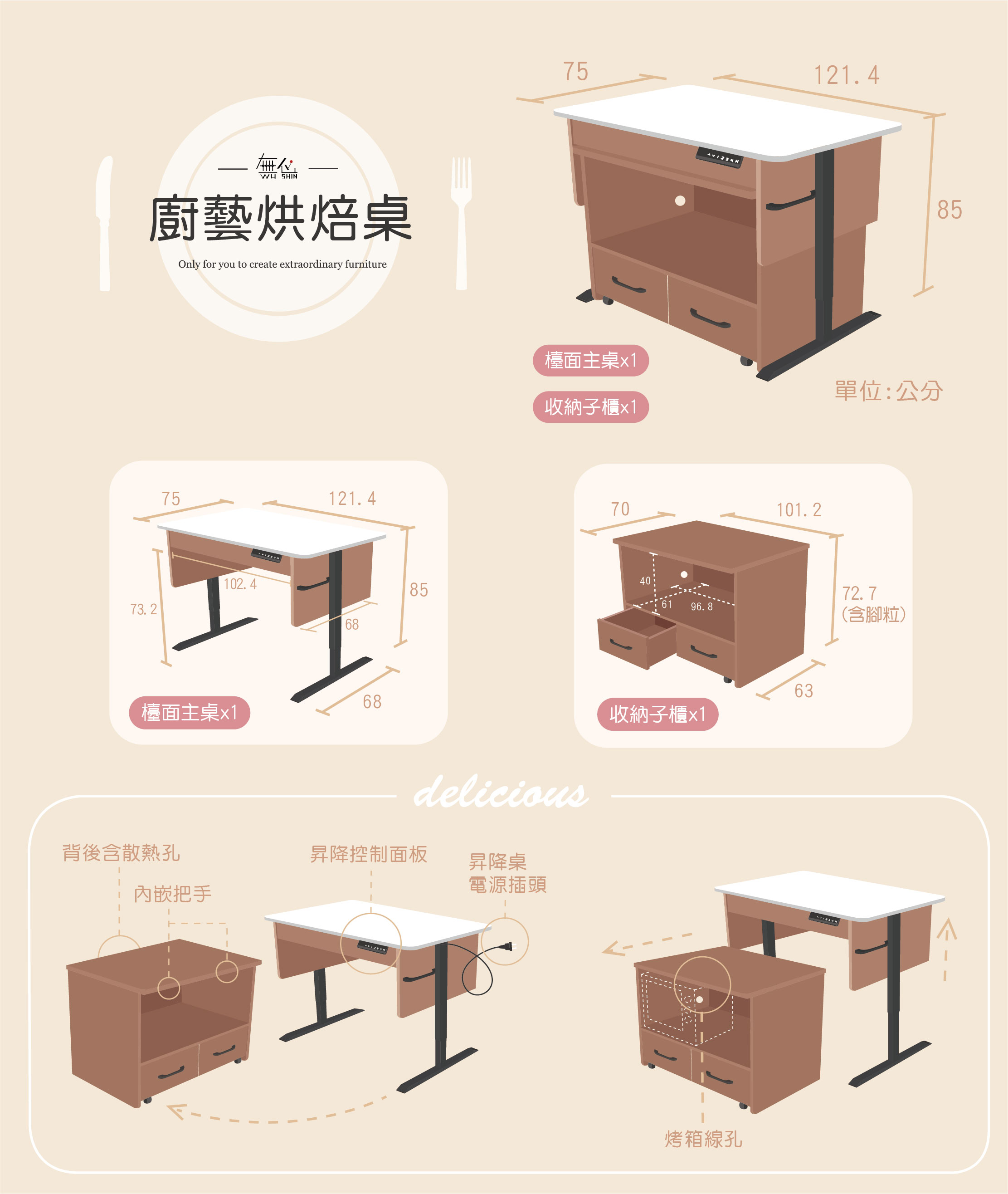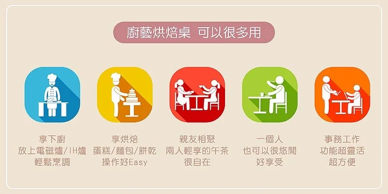 在現今許多家庭或單身朋友在購屋、遷居或租屋時,常因屋內空間有限而犧牲了廚房的空間與功能,這對於需要常常下廚的朋友,相信是非常困擾與不便的,而無心廚藝烘焙廚藝桌具備了可移動的功能,規格精巧,更可創造收納空間,可以讓您的廚房空間不再有需要犧牲選項的困擾,可以隨著您的需求與生活而移動。